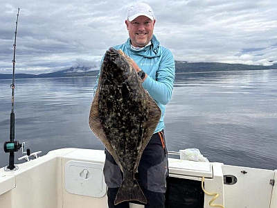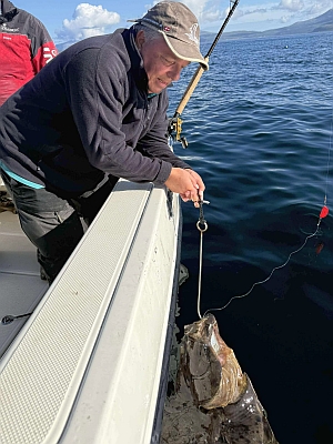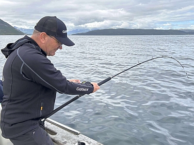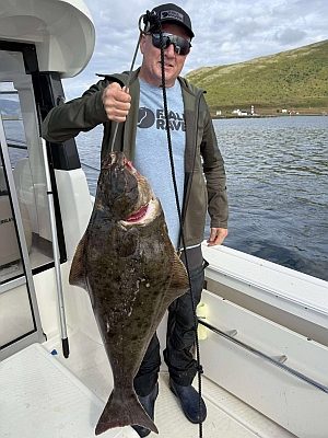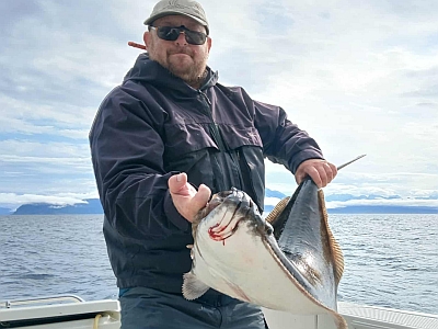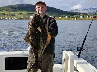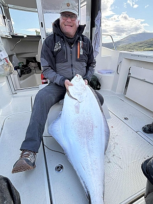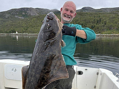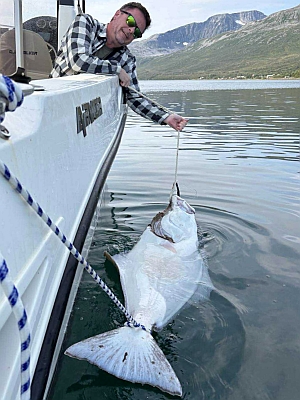 Første gang straks han var kommet til bunden, men han kom fri – og sad så fast igen – men denne gang var der liv i den anden ende. Han sad afslappet på rælingen, da hugget kom, og efter en rolig fight kunne han lande en flot helleflynder i smukt vejr. Senere gik båden ud på dybere vand, hvor der blev fisket målrettet på 160-265 meter vand efter andre arter. Jan valgte dog kun at fiske til 217 meter grundet mængden af line på hjulet. Det gav både kuller, hvilling og sej – og tilmed to rødfisk.