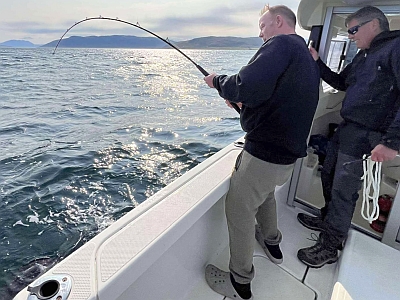 I båd 8 blev det til turens største fangst. Morten fik hug på en sej, der fiskede på 48 meters dybde. Fisken tog lange udløb, og i starten troede de, at den var mistet, men fisken må have svømmet opad, for da linen igen blev strammet op, begyndte fighten for alvor.